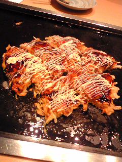 お好み焼きは 豚キムチ。マヨネーズを若干失敗しましたが、焼き具合はプロってました。