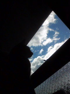 シルエットになってるあずきさんは キャットタワーから外を眺めております。
